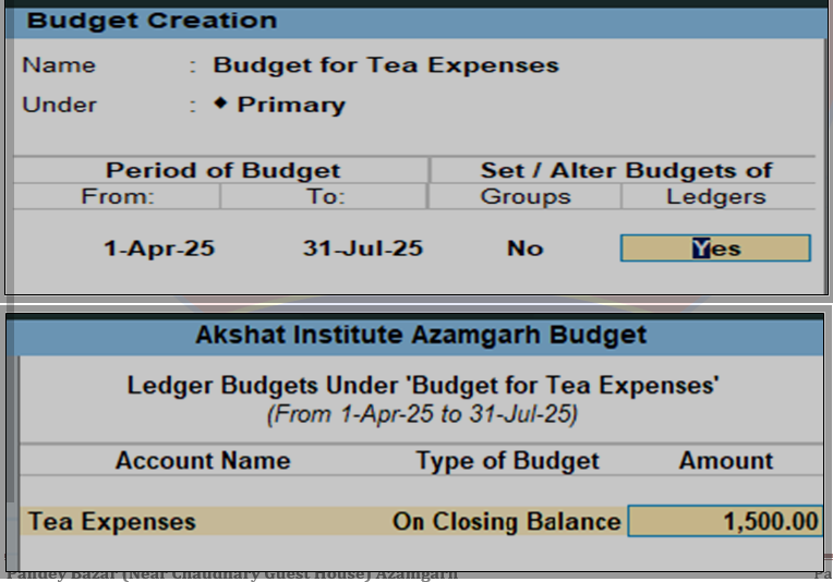 नोट : चाय खर्च से संबंधित बजट बनाने के लिए Tea Expense नाम से पहले से लेजर बना होना चाहिए, क्योंकि बजट क्रीऐट करते वक्त चाय खर्च का लेजर सिलेक्ट करना होगा।