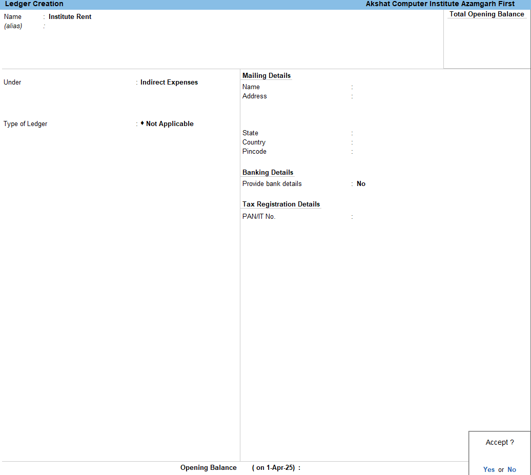 डिटेल्स भरने के बाद Ledger Creation स्क्रीन Accept कर लें। इसी तरह अन्य लेजर भी बना सकते हैं।