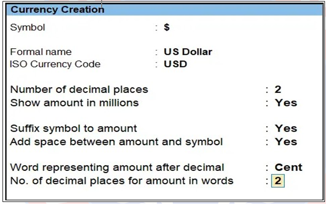 Path : Gateway of Tally>Create>Currency