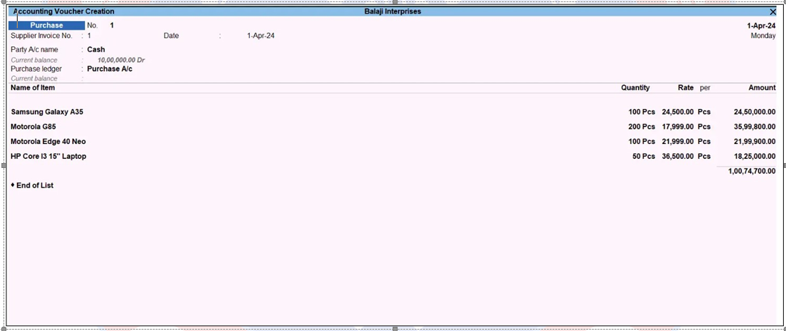 Note – After entering the quantity and rate for the Samsung Galaxy A35, press Enter and select the next stock item (Motorola G85), and enter its quantity and rate as well. Similarly, select all the items one by one and enter their quantities and rates. Keep the remaining options as default and accept the voucher (Ctrl+A).