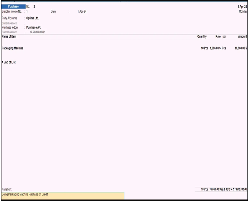प्रश्न 1 – कंपनी ने 1-4-2024 को Optima Ltd. से 10 पीस Packaging Machine $1666/pcs के रेट से उधार खरीदी।