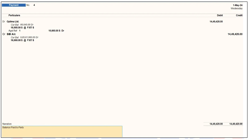 भुगतान करने के बाद बैलन्सशीट चेक करेंगे तो Optima Ltd. का बकाया बैलेंस क्लीयर हो जाएगा, लेकिन Unadjusted Forex Gain/Loss मे कुछ Debit वैल्यू दिखाई देगी, जो Forex Loss वैल्यू है। यह वैल्यू भुगतान करते वक्त Rate of Exchange मे Dollar की कीमत बढ़ने पर उत्पन्न हुई है। क्योंकि जब Optima Ltd. से Purchase किया था तो Dollar का रेट ₹83/$ था, तथा बकाया भुगतान ₹87/$ के रेट से किया है, इसलिए ये Unadjusted Forex Gain/Loss अमाउन्ट प्रदर्शित हुआ है।