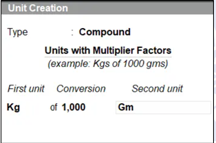 As mentioned above, a compound unit is formed by combining two simple units. Therefore, before creating a compound unit, make sure that both simple units have already been created. For example, to represent a quantity like 1 kg 500 gm, create the compound unit as follows.