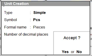 इसके बाद Unit Creation स्क्रीन को Accept कर लें। इस तरह से Pcs नाम से सिम्पल यूनिट बन जाएगा।