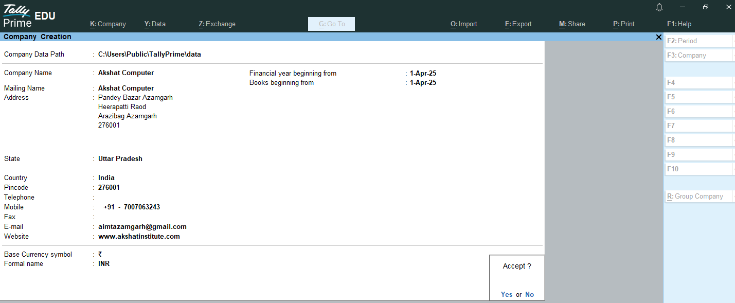 अब Company Creation फॉर्म को Enter प्रेस करके Accept कर लें। इस तरह से कंपनी सक्सेसफुली (Successfully) क्रीऐट हो जाएगी।