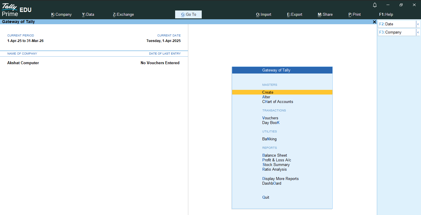 Leave the remaining settings as “No”. After setting all the fields, press the Enter button to accept the window. The Gateway of Tally window will then open, which will look like this: