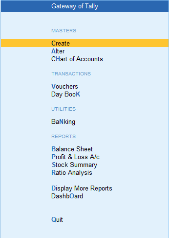 Gateway of Tally टैली की मुख्य होम विंडो होती है, यहीं से टैली के सम्पूर्ण फीचर्स को एक्सेस किया जाता है। Gateway of Tally मे Masters, Transactions, Utilities और Reports के अंतर्गत जो भी ऑप्शन आते हैं